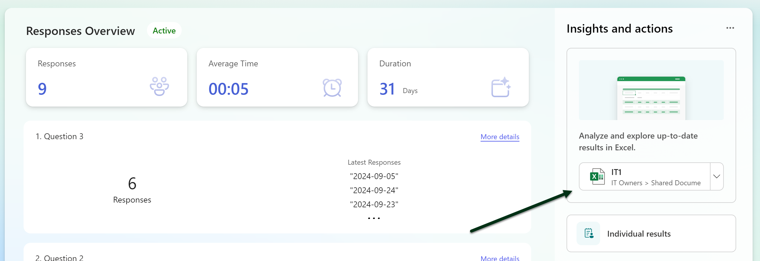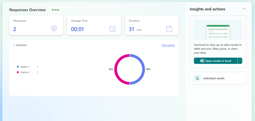 Jatkossa vastaukset sisältävä Excel-tiedosto muodostuu vasta kun se avataan MS Forms -palvelusta ensimmäisen kerran. Eikä tätä voi tehdä ennen kuin lomakkeella on lähetetty vähintään yksi vastaus.