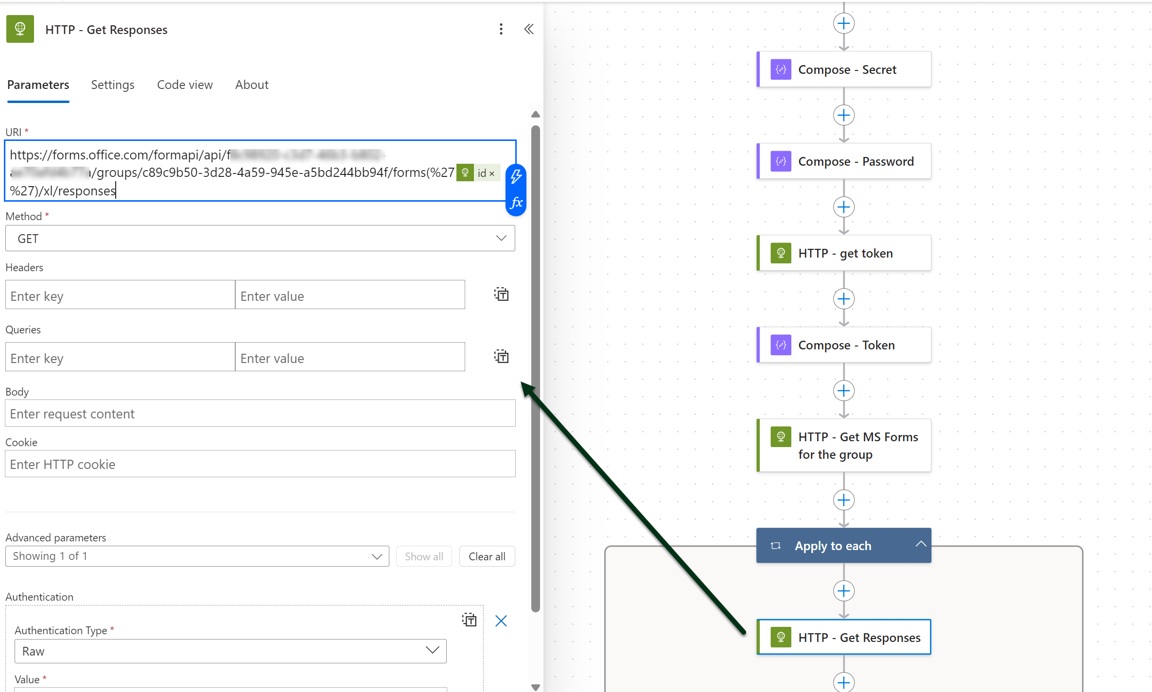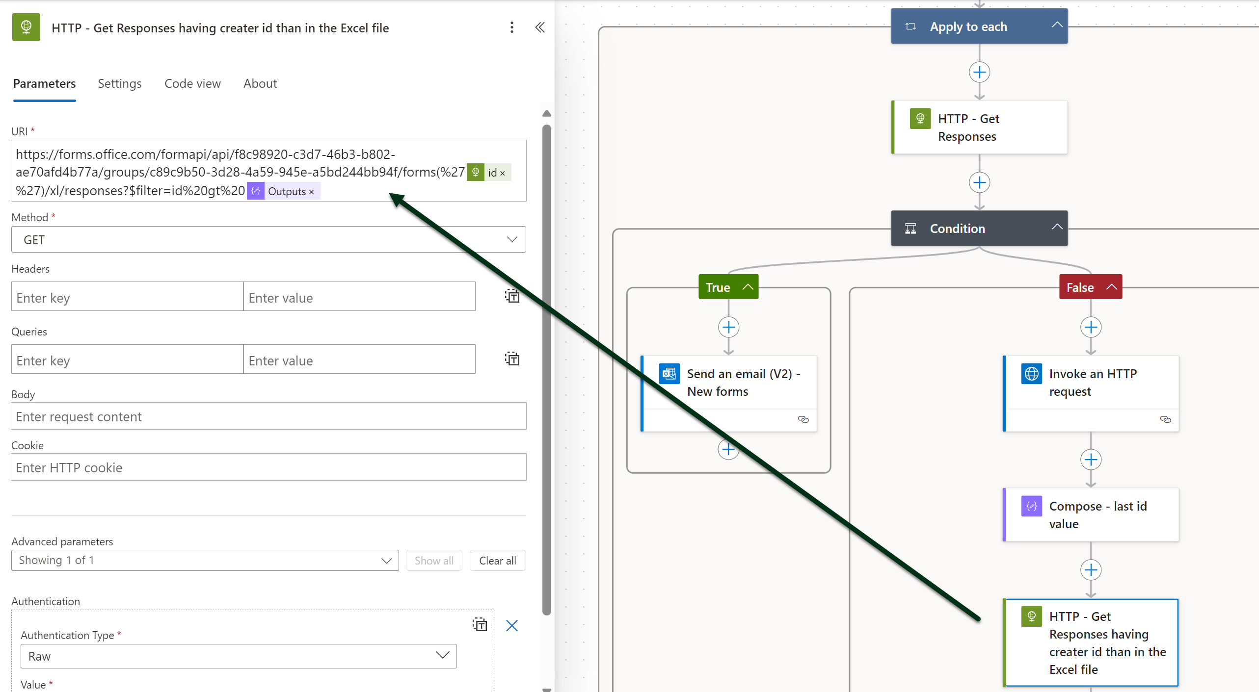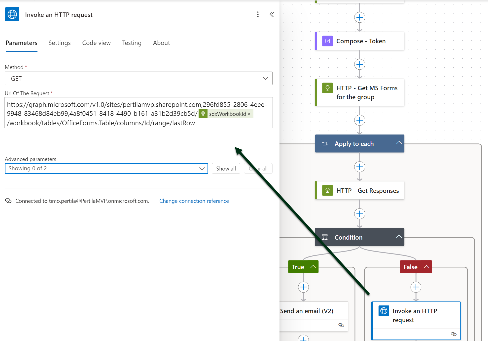 Nyt voimme hakea vastausexcelien viimeisen rivin tiedot. Haku onnistuu HTTP with Microsoft Entra ID (preauthorized) -yhdistimellä.