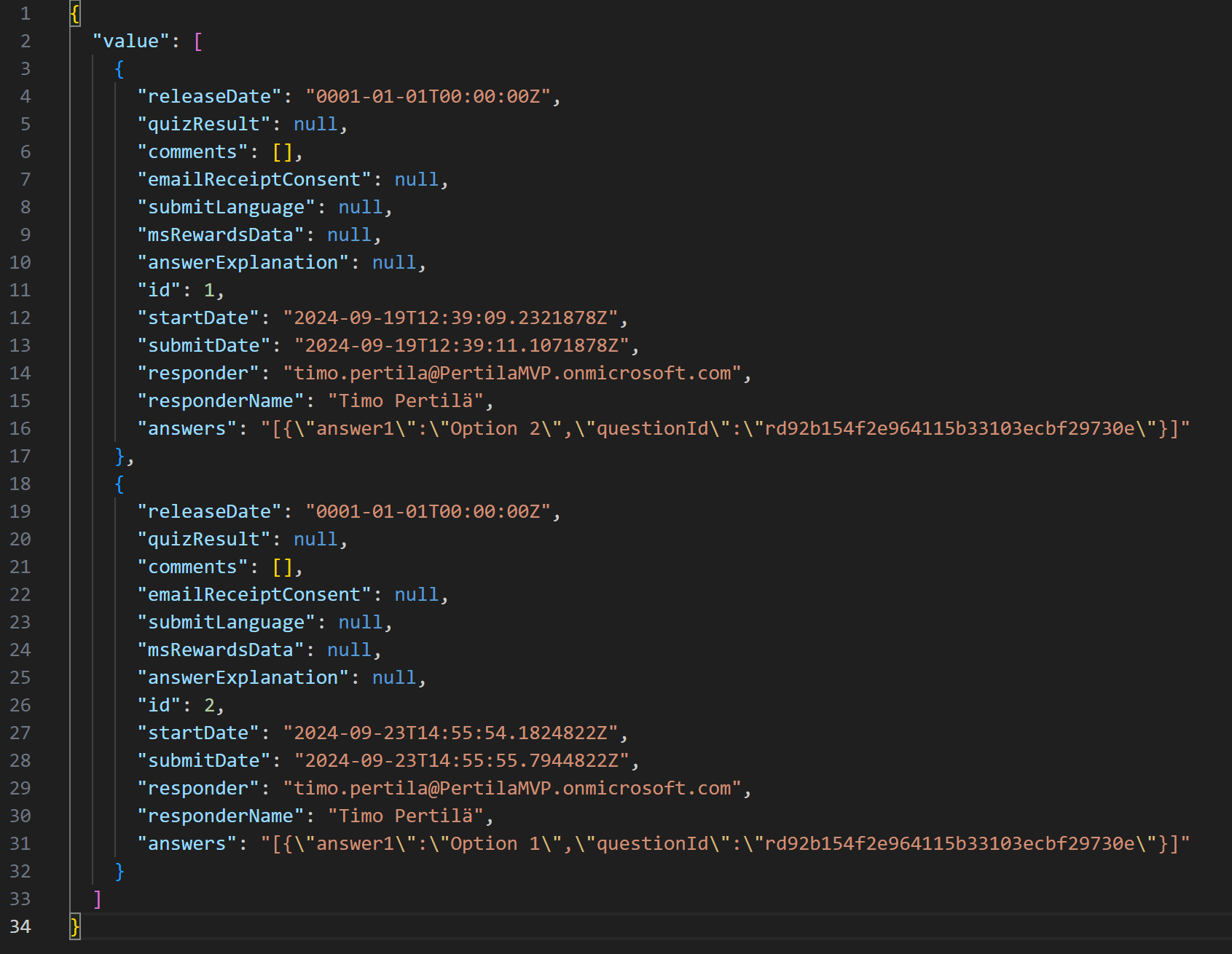 Haetaan tämän jälkeen lomakkeen vastaukset uudelleen. Tällä kertaa ainoastaan ne vastaukset, joiden id on suurempi kuin mitä Excelistä löysimme (filter=id gt n).