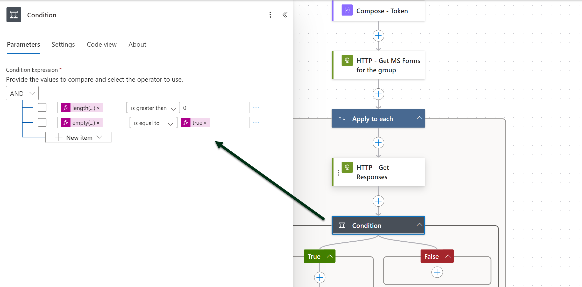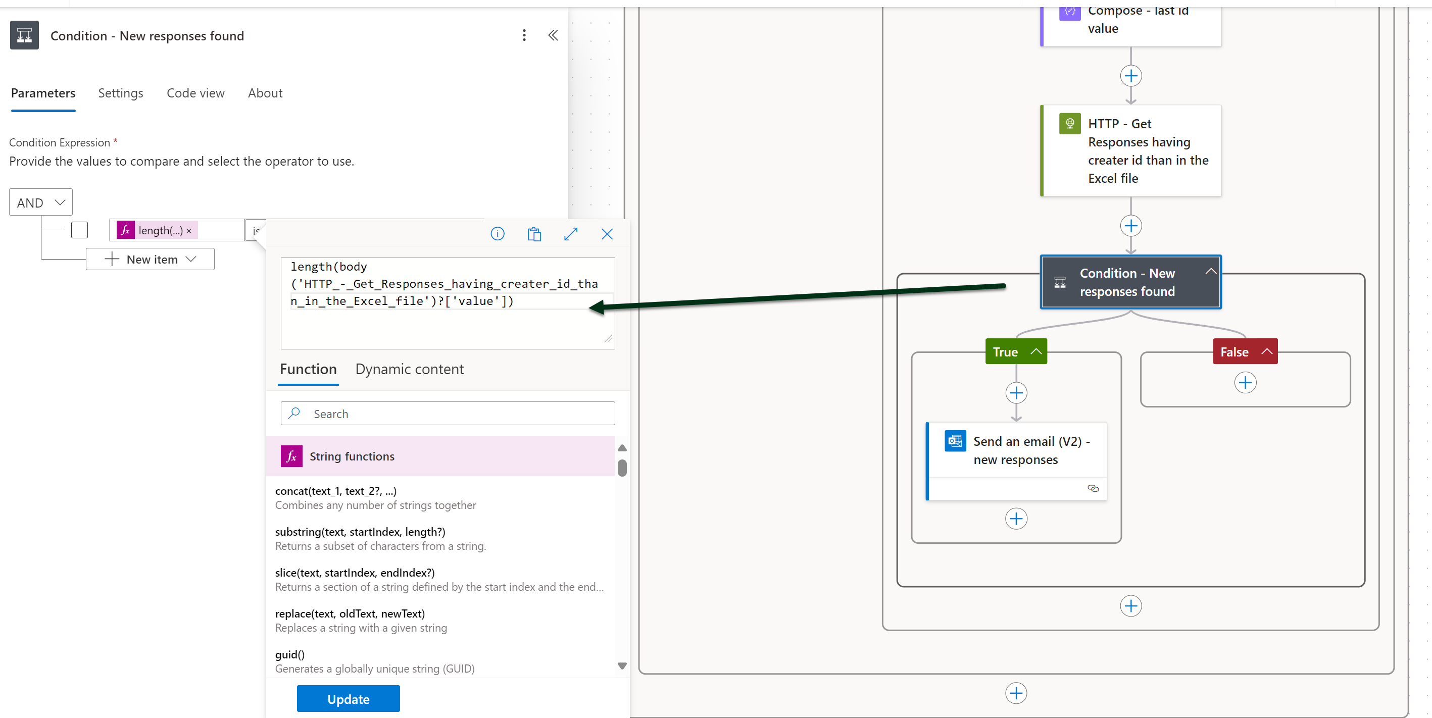 length(body('HTTP_-_Get_Responses')?['value']) is greater than 0 AND