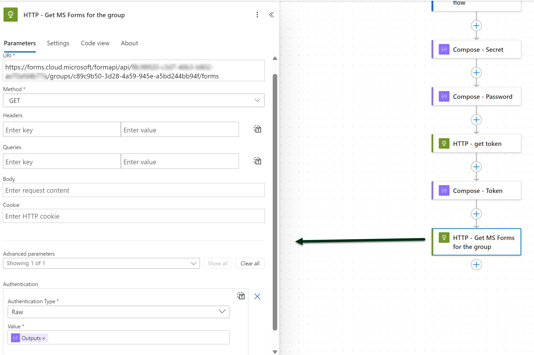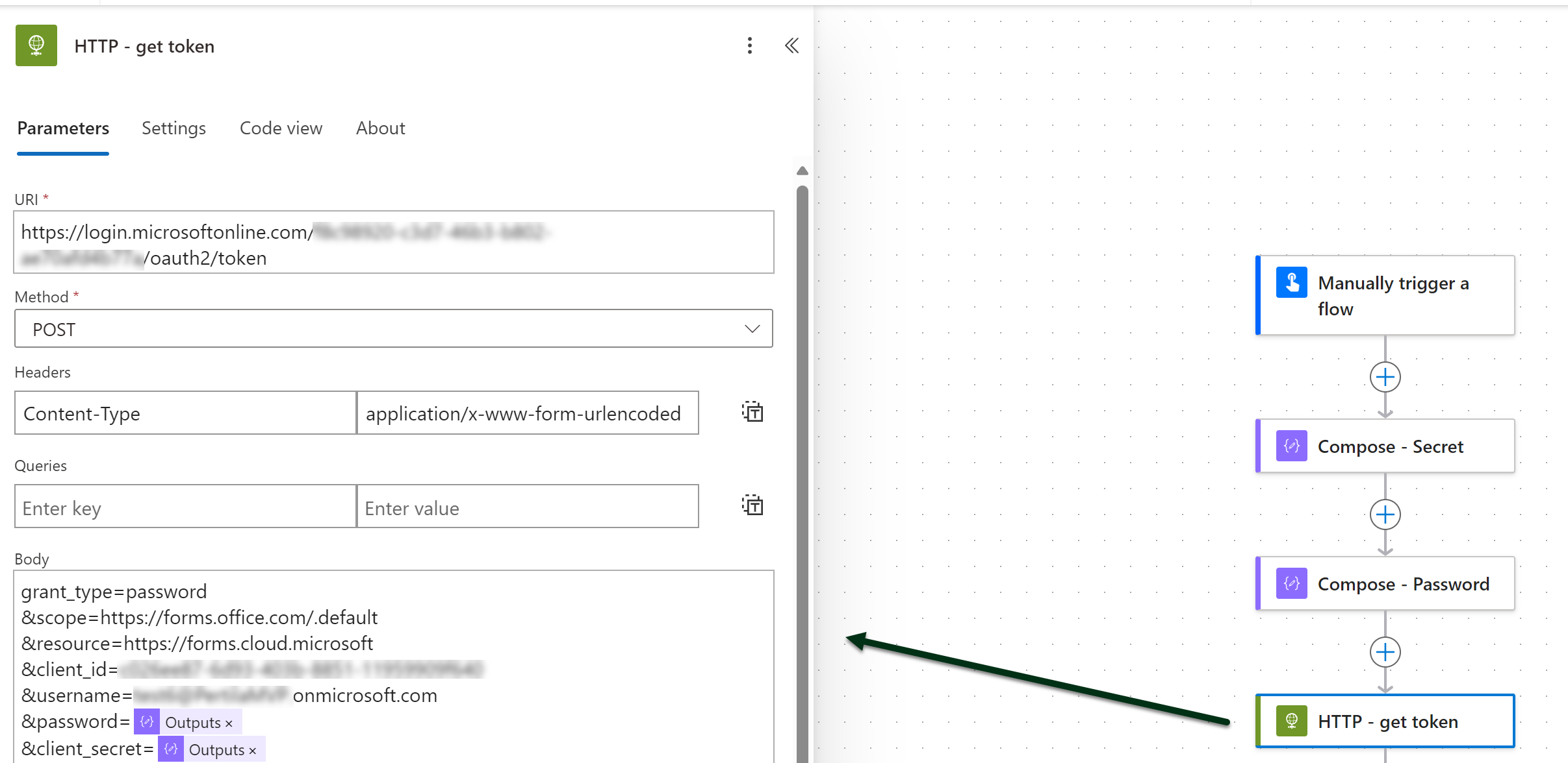Flow’ssa tämä näyttää seuraavalta. Autentikoinnissa (alin kohta) käytetään ensimmäisen http-kutsun palauttamaa tokenia.