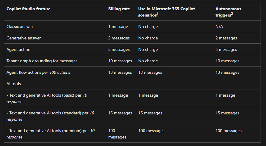Paljonkos agentin kanssa keskustelu sitten maksaa? Toiminnot kuluttavat viestejä (message), jotka maksavat 0.01$ kappale. Mikäli käyttäjällä on Microsoft 365 Copilot -lisenssi, se kattaa ko käyttäjän kyselyt.