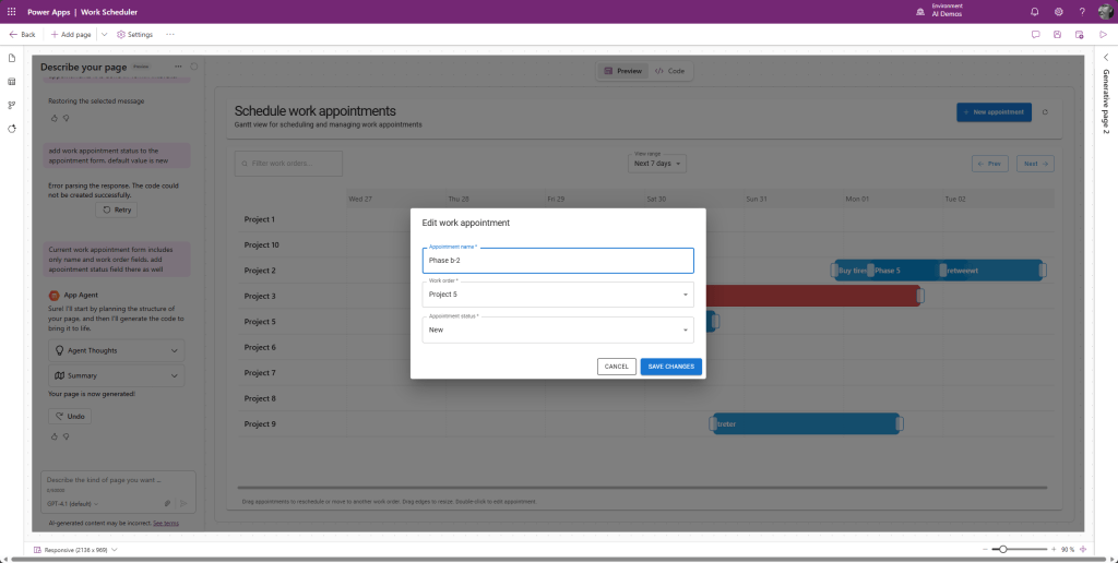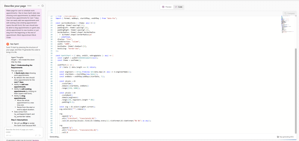 Tämänhetkisen kokemuksen perusteella lähtisin edelleen rakentamaan sovellusta generative pages -toiminnallisuudella kuten teimme edellisessä jutussa. Ensin perustoiminnallisuus kasaan (esim Gantt-kaavion esittäminen). Ja sitten pikkuhiljaa pyydetään tekoälyä rakentamaan siihen lisää ominaisuuksia. Yksi kerrallaan.