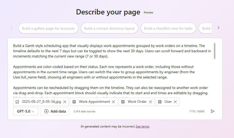 Hyvä kysymys. Toiminnallisuus on edelleen preview-vaiheessa. Toisina päivinä se tuntuu toimivan paremmin kuin toisina. Tänään en saanut siitä ulos mitään toimivaa. Mutta oliko syy liian pitkän / huonon / monimutkaisen promptin? En voi lopputuloksen perusteella tietää.