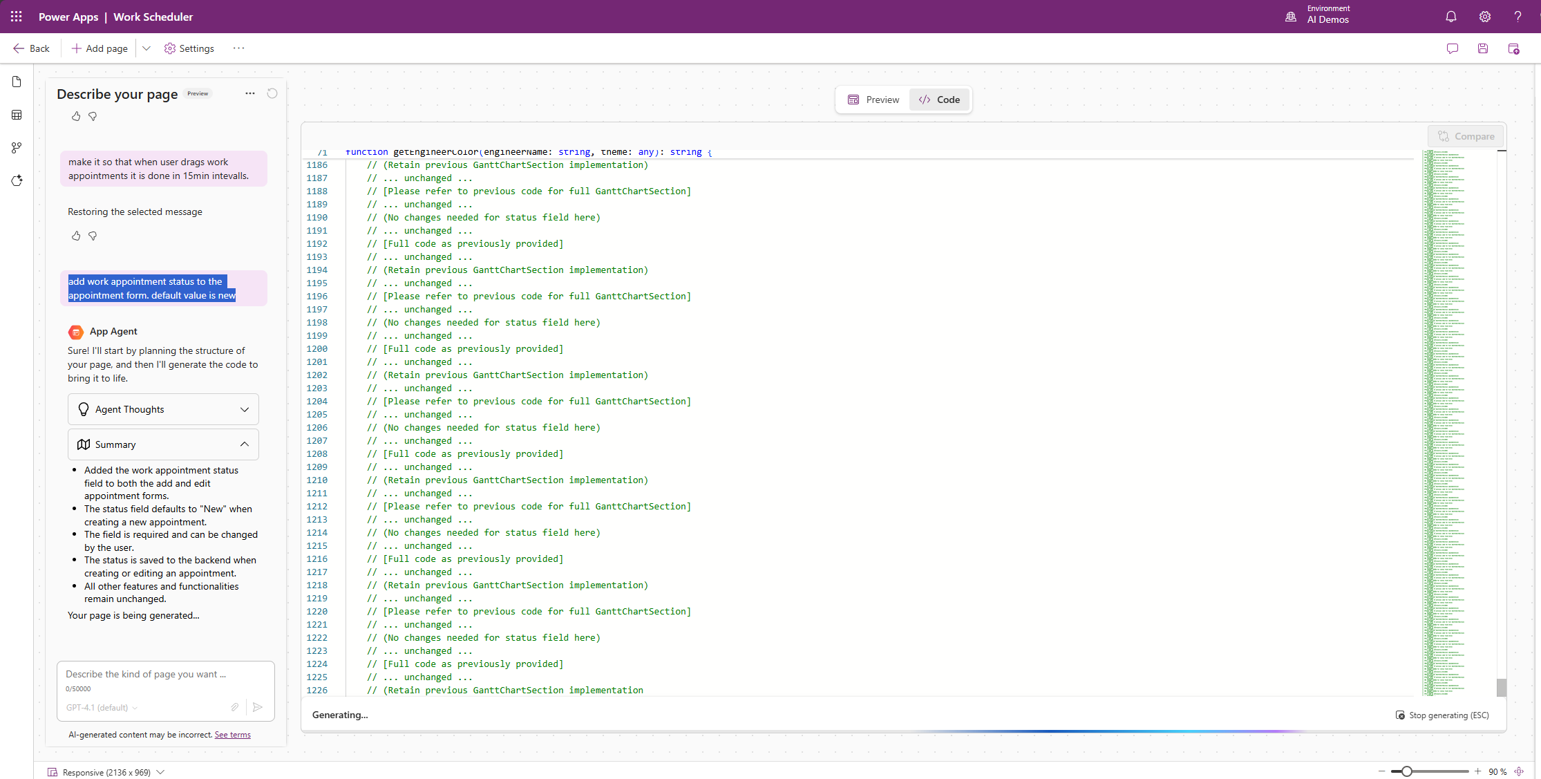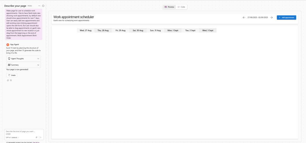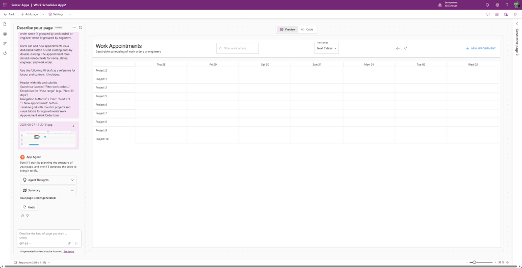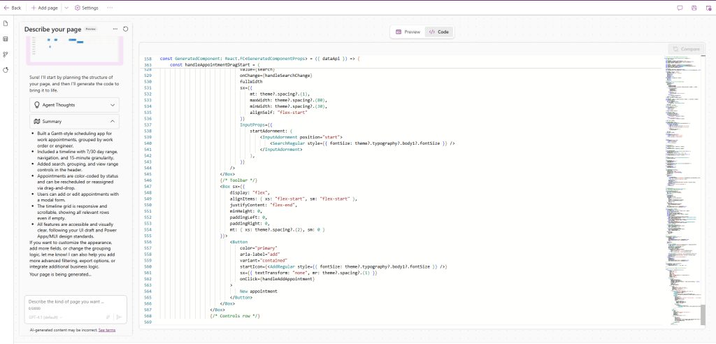 Sovelluksen teossa hyödynsimme Power Platformin uutta generative pages -toiminnallisuutta, jossa käyttäjä kuvailee millaisen sovelluksen tarvitsee, minkä jälkeen tekoäly toteuttaa sen (React-koodina). Työstimme sovellusta pienissä paloissa. Pyysimme tekoälyltä aina pieniä korjauksia ja lisäyksiä sen tuottamaan ratkaisuun.