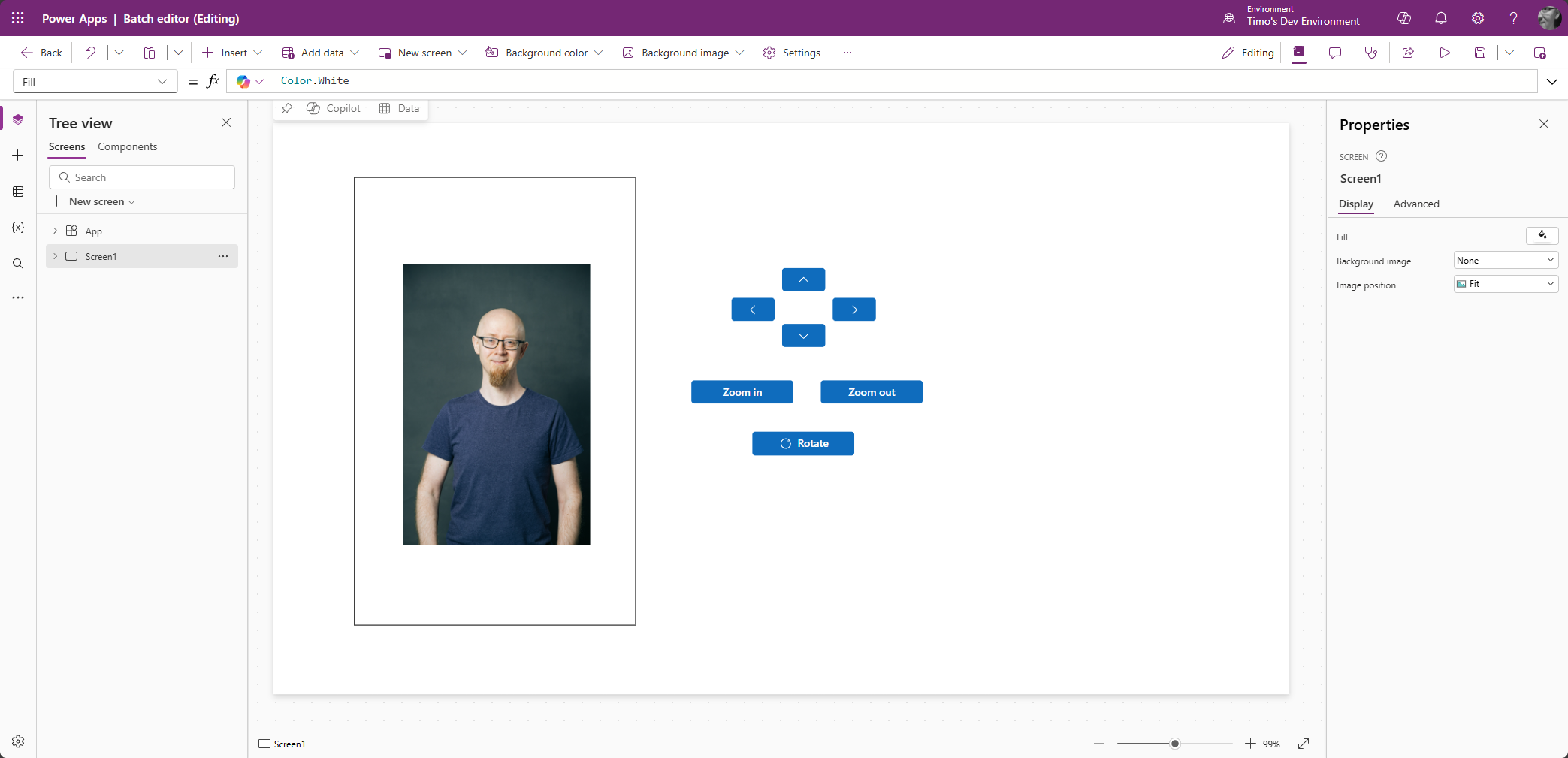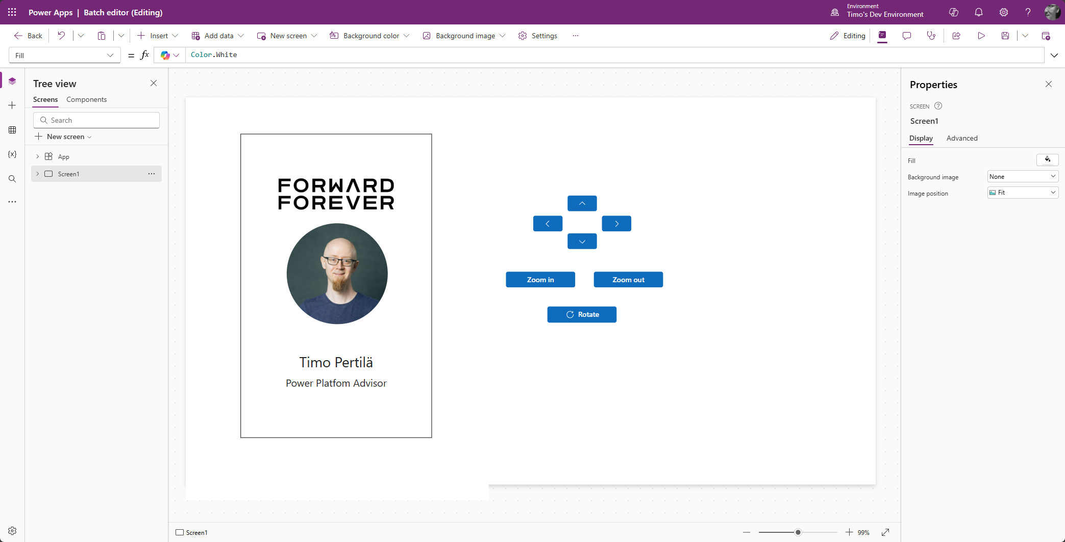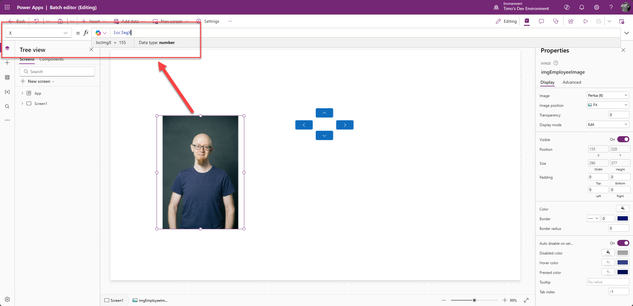Power Appsissa ei ole mitään ”tartu ja raahaa” -ominaisuutta, joten kuvan asemointi tulee toteuttaa hieman tylsemmin.
