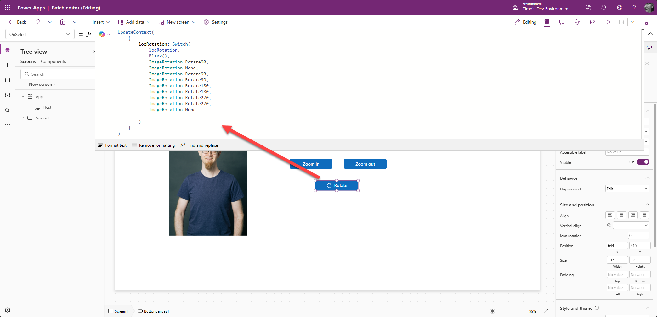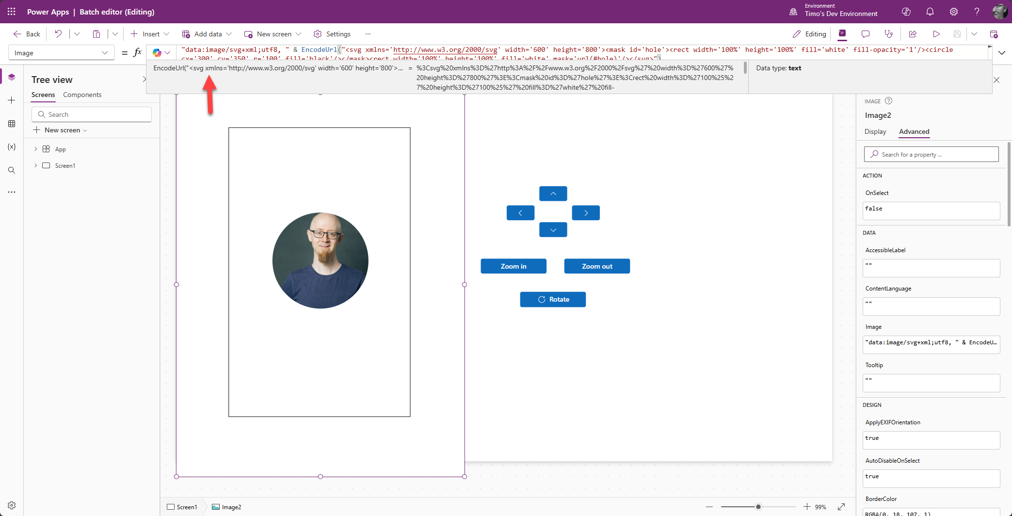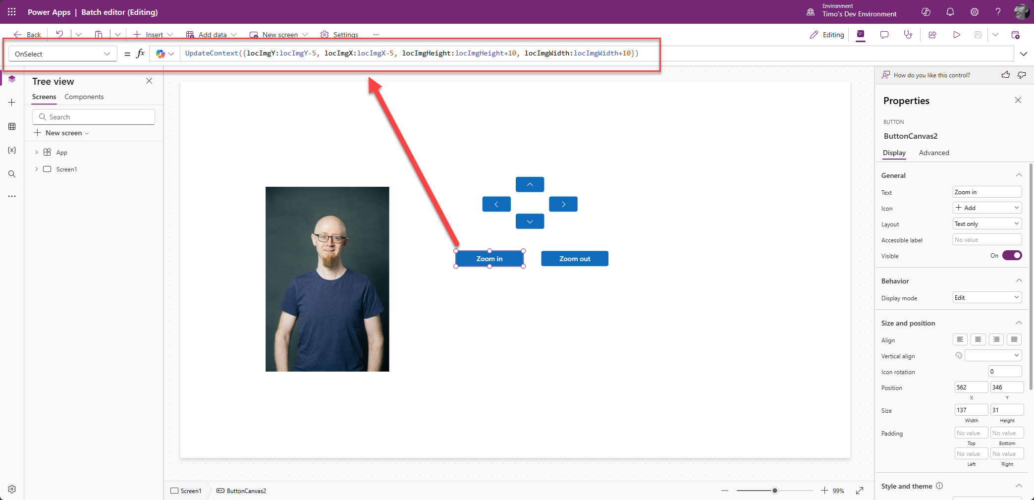 Power Appsissa ei ole mitään ”tartu ja raahaa” -ominaisuutta, joten kuvan asemointi tulee toteuttaa hieman tylsemmin.