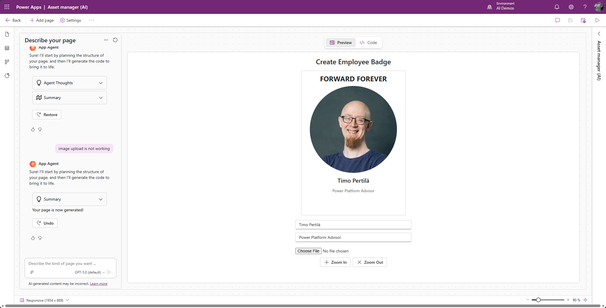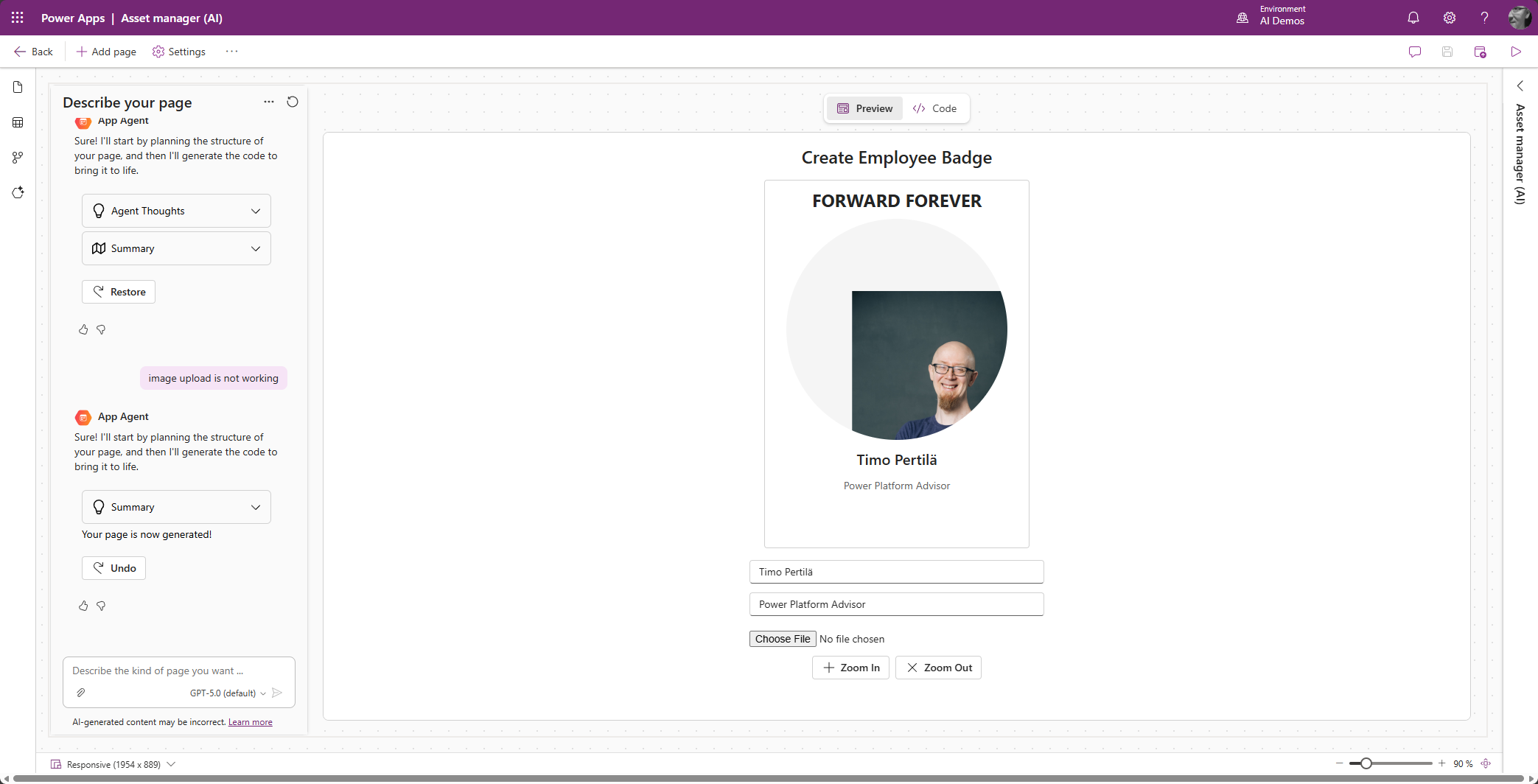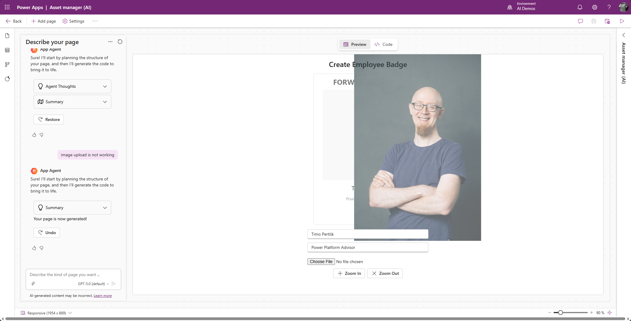 Oletan että kuvan voisi raahata oikeaan paikkaan tekemällä tätä varten oman PCF-kontrollin. Mutta kuka haluaa koodata enää mitään, kun voi vibe-koodata!