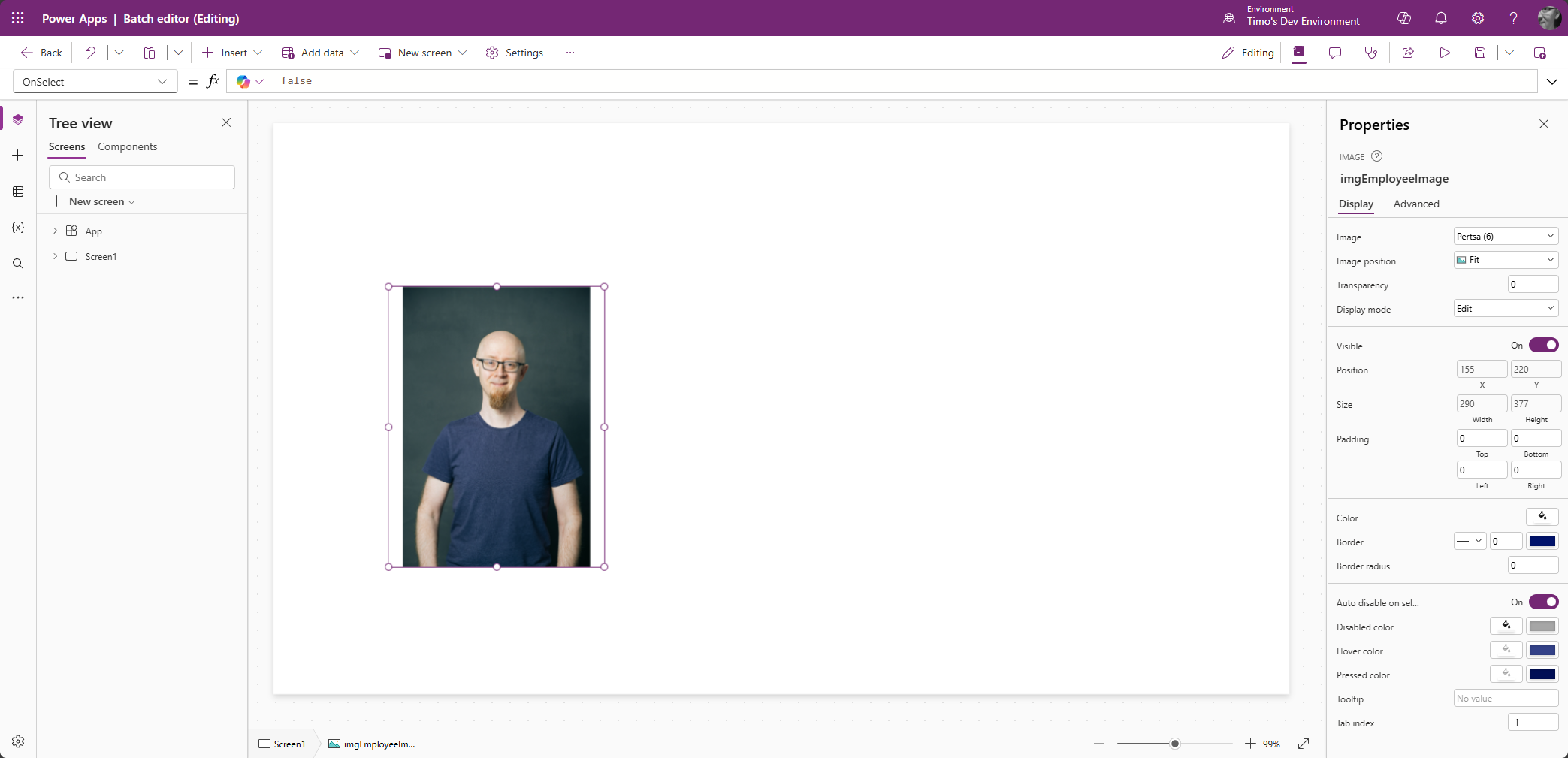Aloitetaan lisäämällä sovellukseen kuvakontrolli. Ladataan siihen esimerkkikuva työntekijästä.