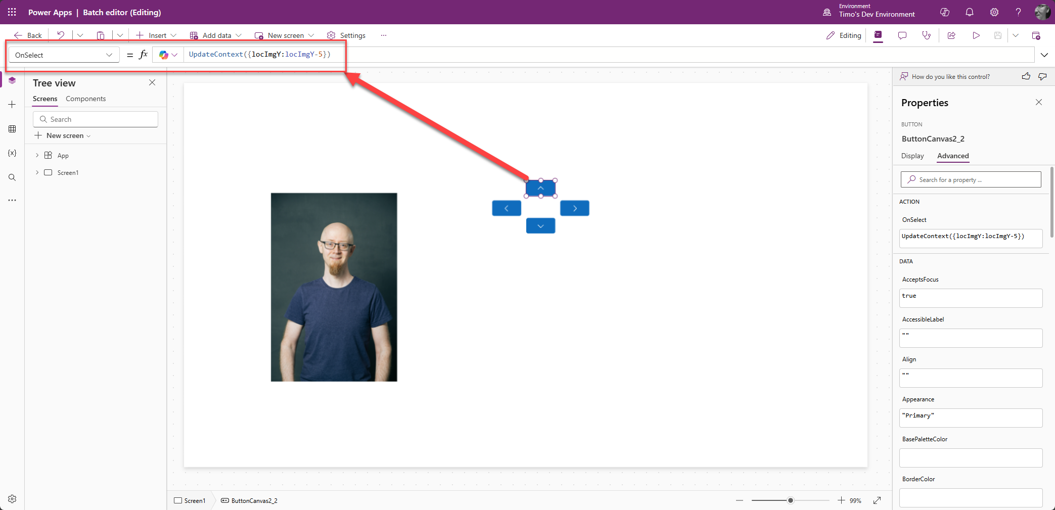 Painikkeiden painaminen (OnSelect) päivitää kuvan x tai y arvoa.