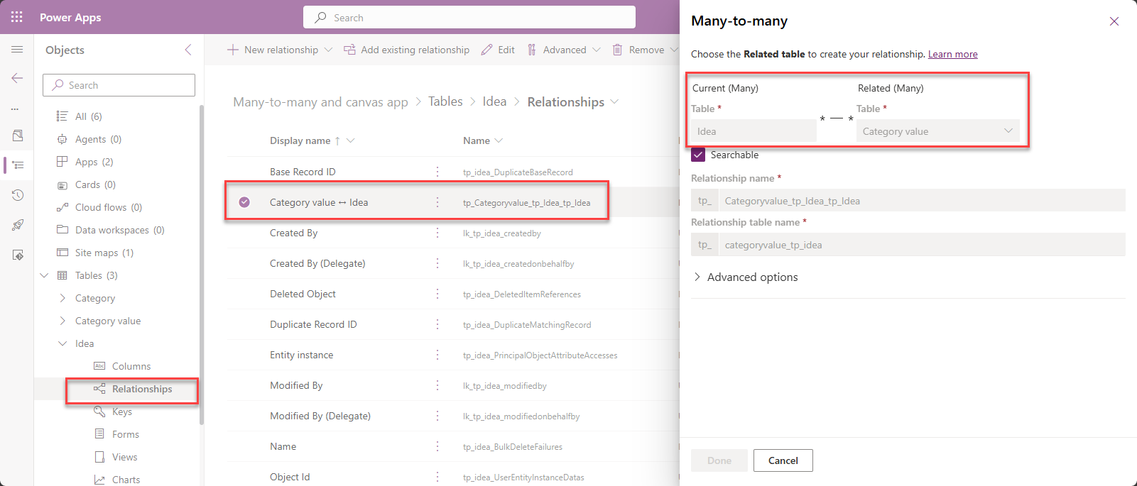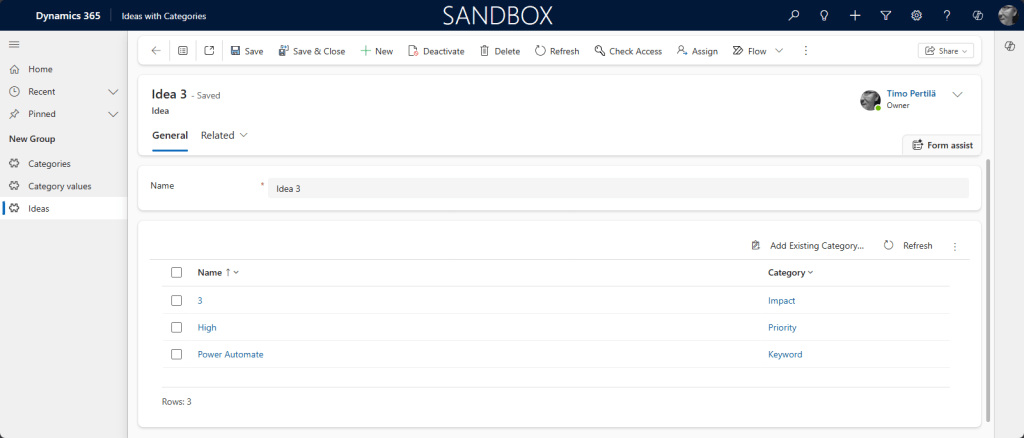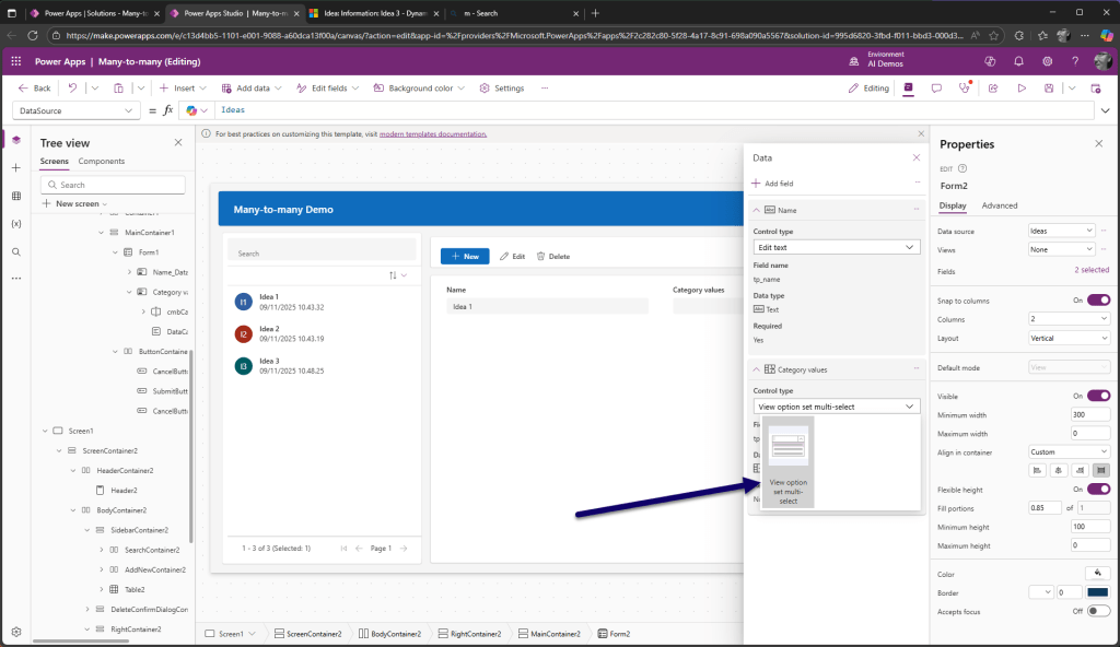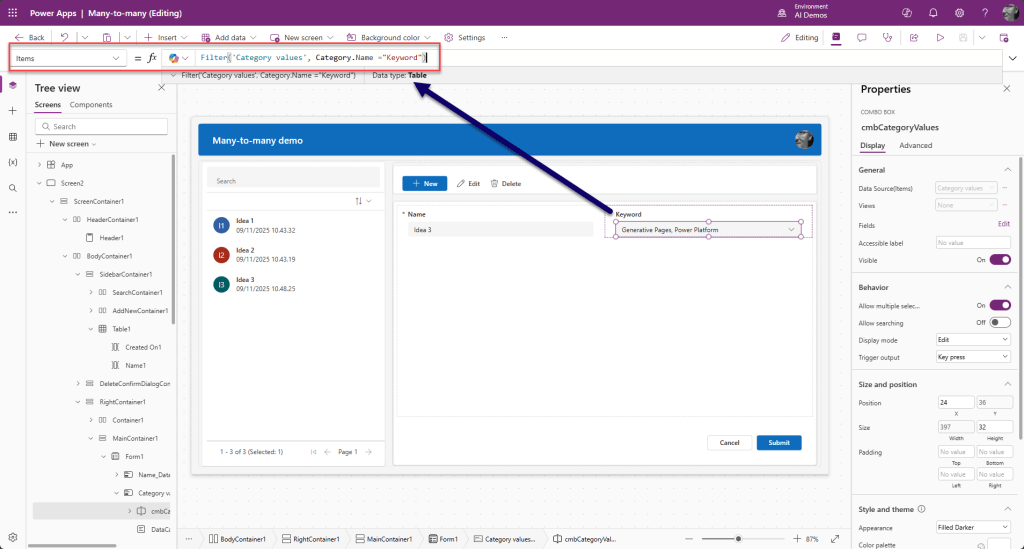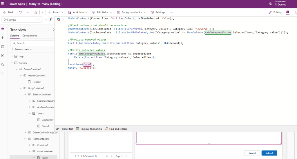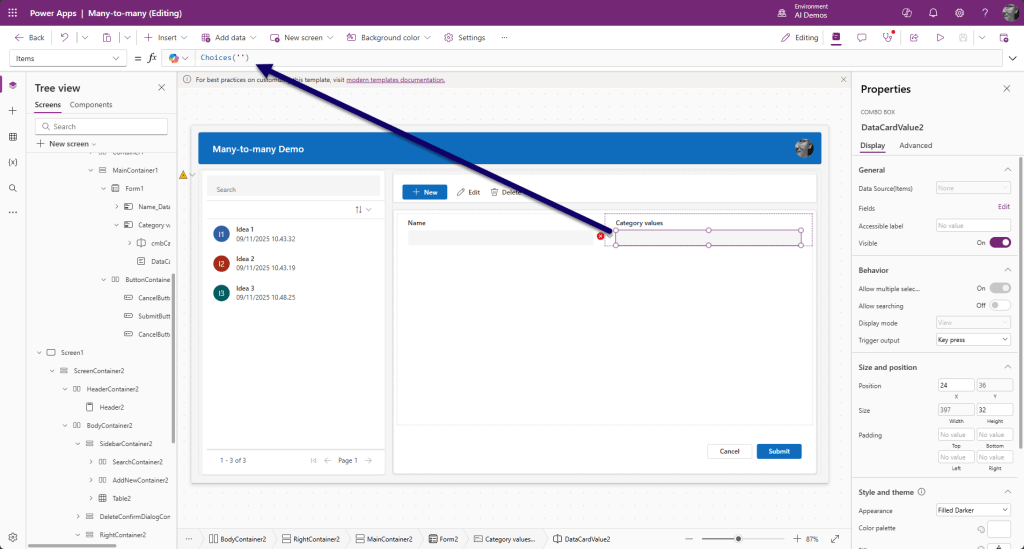 Moni-moneen yhteyksiä muokataan Canvas Power appsissa Power Fx:n Relate ja Unrelate-funktioilla. Pelkkä lomakkeen lähetys tai Patch -komento ei siis riitä. Lisäksi idea ja luokittelujen arvot -taulujen välillä oleva relaatio sisältää myös priorieetit ja vaikutukset. Lomakkeella kuitenkin ylläpidetään ainoastaan idean avainsanoja.