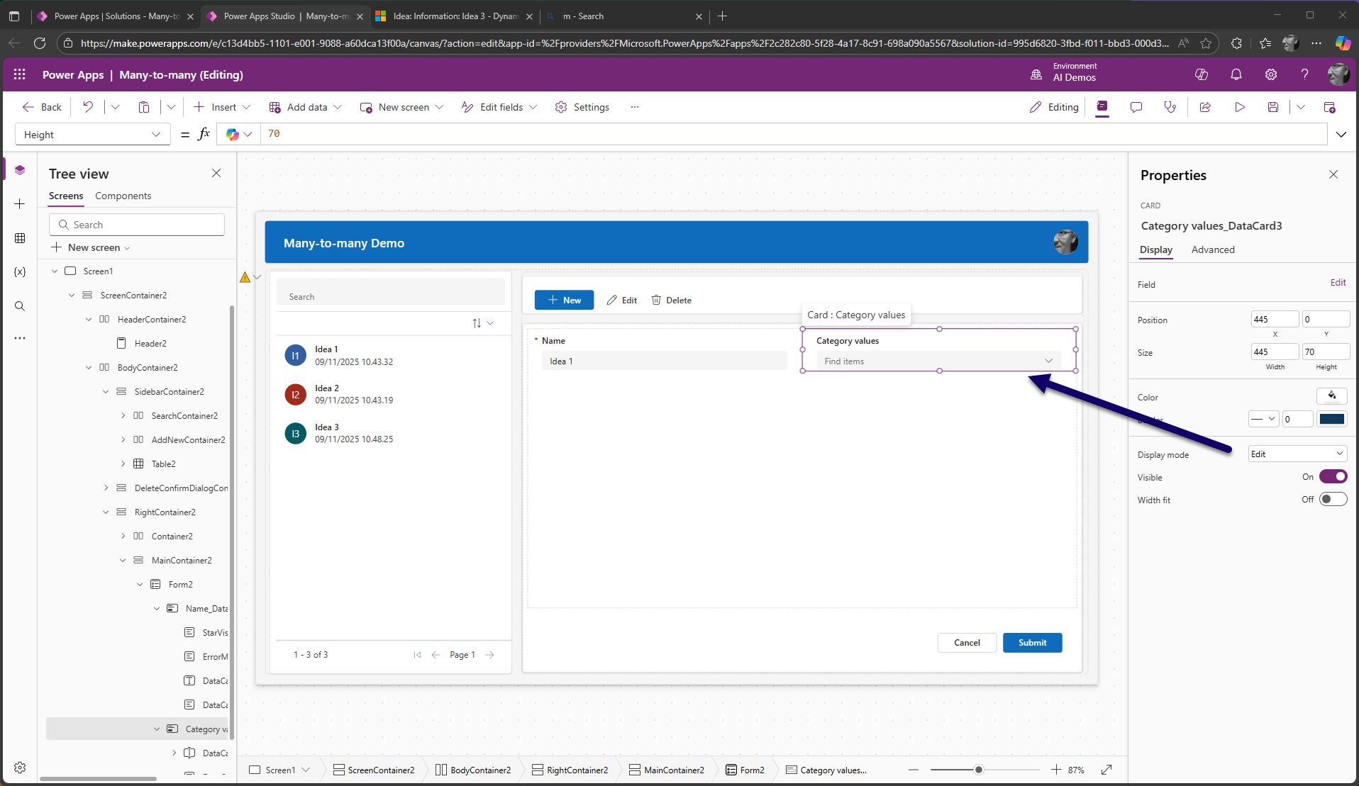 Vaihdetaan lomakkeen kortin tilaksi Display Mode = Edit ja käydään määrittelemässä mikä Category values -taulun kenttä siinä näytetään (= name).