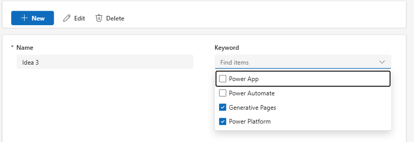 Ei ainakaan Power Platformin työkaluilla. Generatives pagesilla luotu sivu ei kykene näyttämään ideoiden avainsanoja. Eikä tallentamaan niitä.