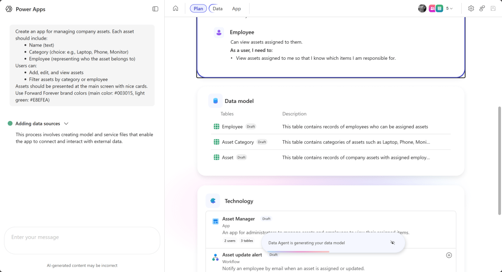 Vibe Power Apps näyttää epäilyttävän paljon plan designerilta. Ikäänkuin se olisi irroitettu plan designerista omaksi kokonaisuudekseen.