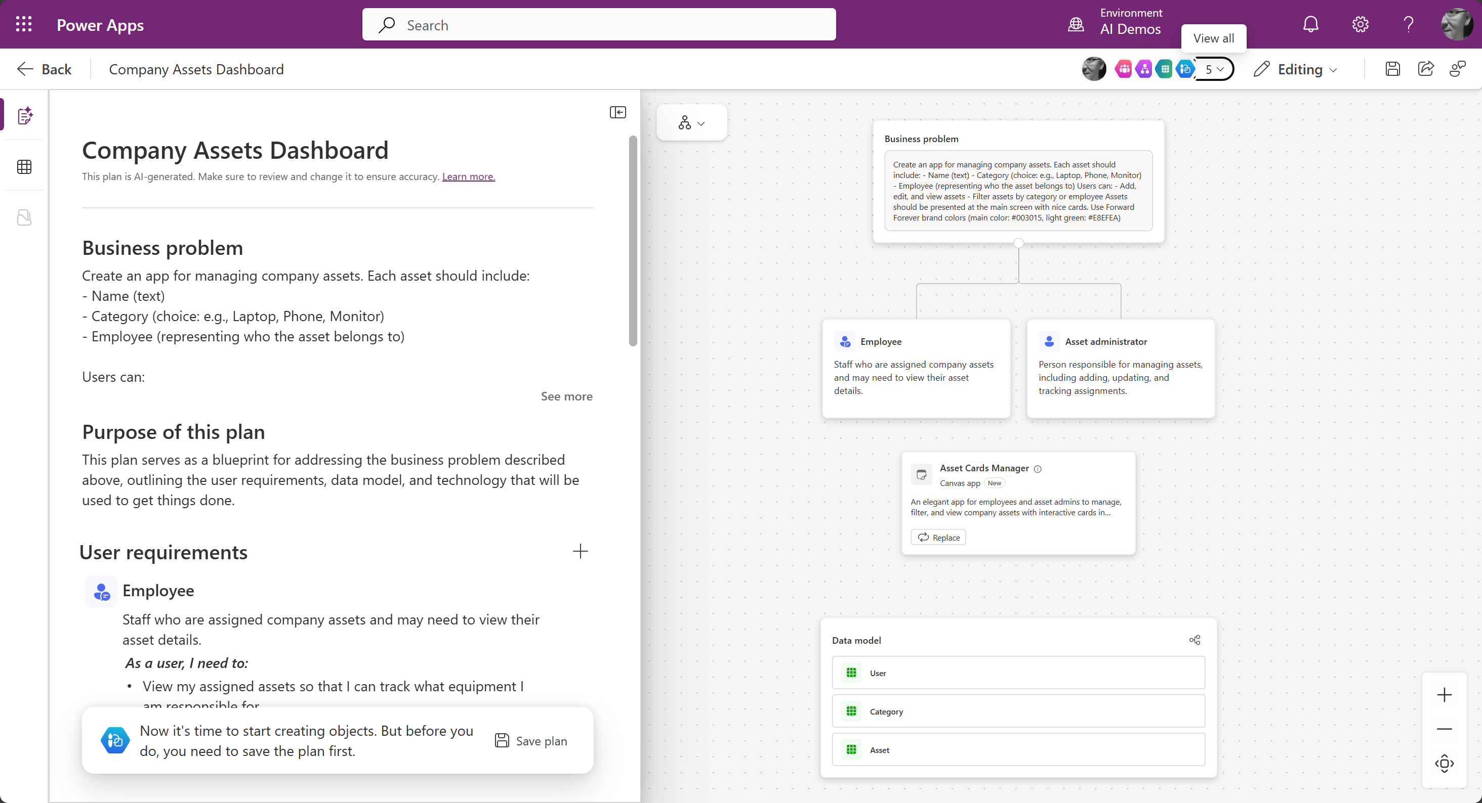 Vibe Power Apps näyttää epäilyttävän paljon plan designerilta. Ikäänkuin se olisi irroitettu plan designerista omaksi kokonaisuudekseen.