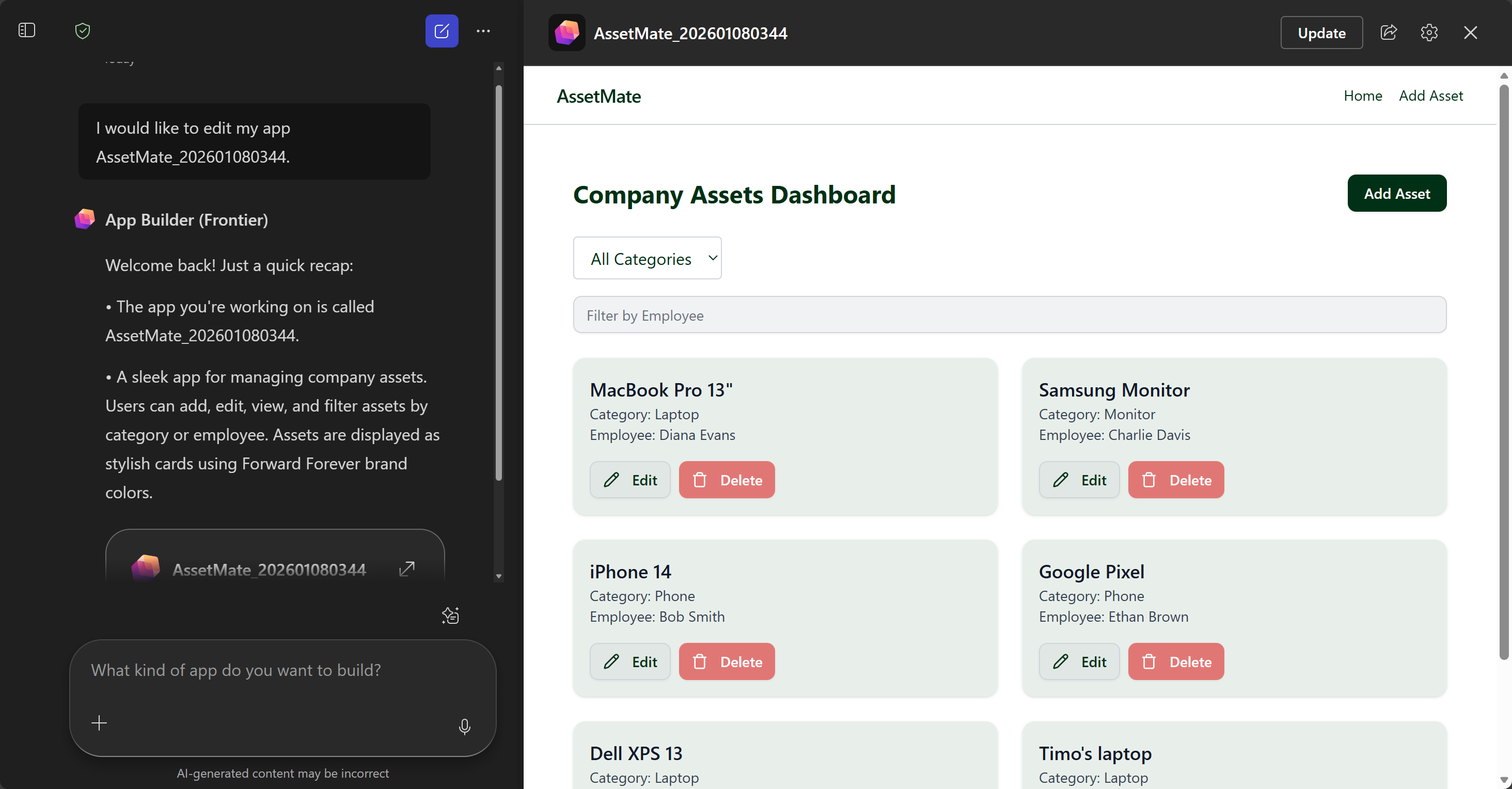 App Builder taas on vibe-ohjelmointia aidoimmillaan. Sinulla on käytössäsi ainoastaan chat-ikkuna, jolla pyydät App Builderia rakentamaan sovelluksen ja tekemään muutoksia siihen. Työkalun generoimaa koodia ei ole edes mahdollista käydä väijymässä.