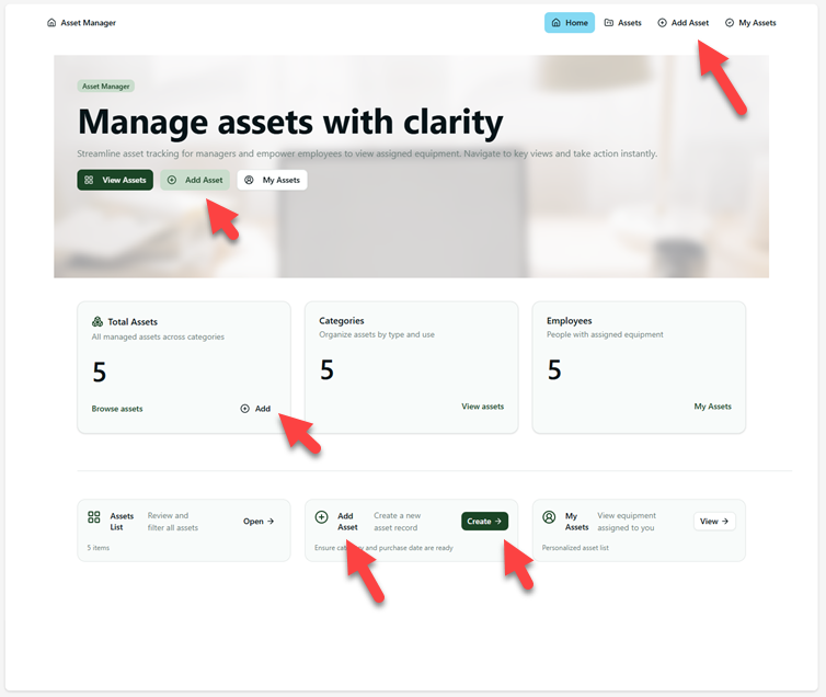 Sen erityisominaisuus on visuaalisesti näyttävien, mutta turhia graafisia elementtejä täynnä olevien sovellusten rakentaminen. Alla on kuva assettien hallinta -työkalusta. Pääsivulla ei näy asset-listaa ollenkaan. Sen sijaan meillä on 5 eri paikkaa, mistä voi luoda uuden assetin.