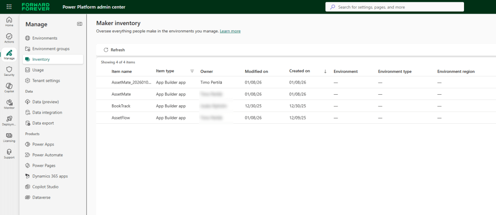 Tehdyt sovellukset näkyvät Power Platform Admin Centerissä,