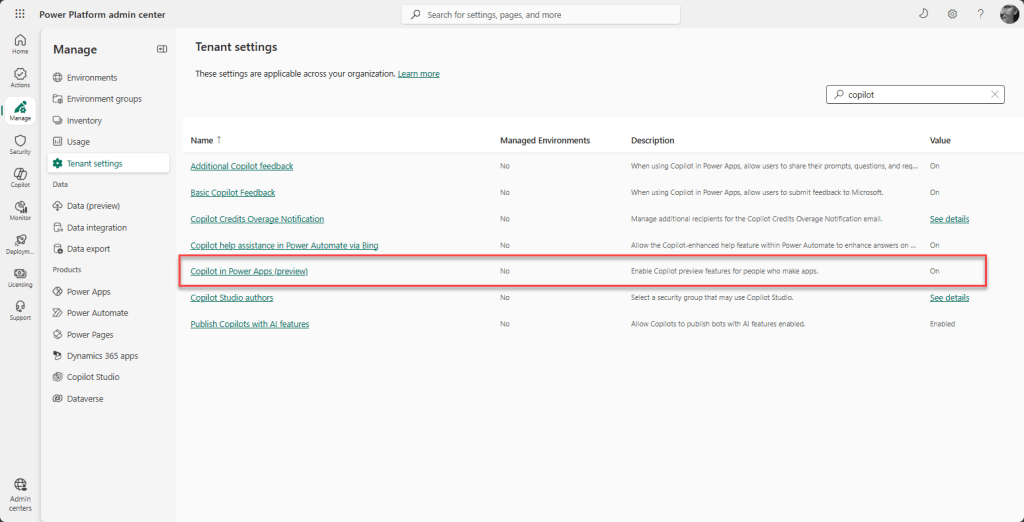 Yksi tapa estää vibe Power Appsin käyttö on kieltää Copilotin käyttö Power Appseissa koko organisaation tasolla (tenant level).