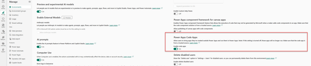 Power Apps Code Appsit ovat ehkä hieman yllättäen hallinnan kannalta selkeimmät. Ensinnäkin niiden käyttö sallitaan aina erikseen ja tämä tehdään ympäristökohtaisesti.