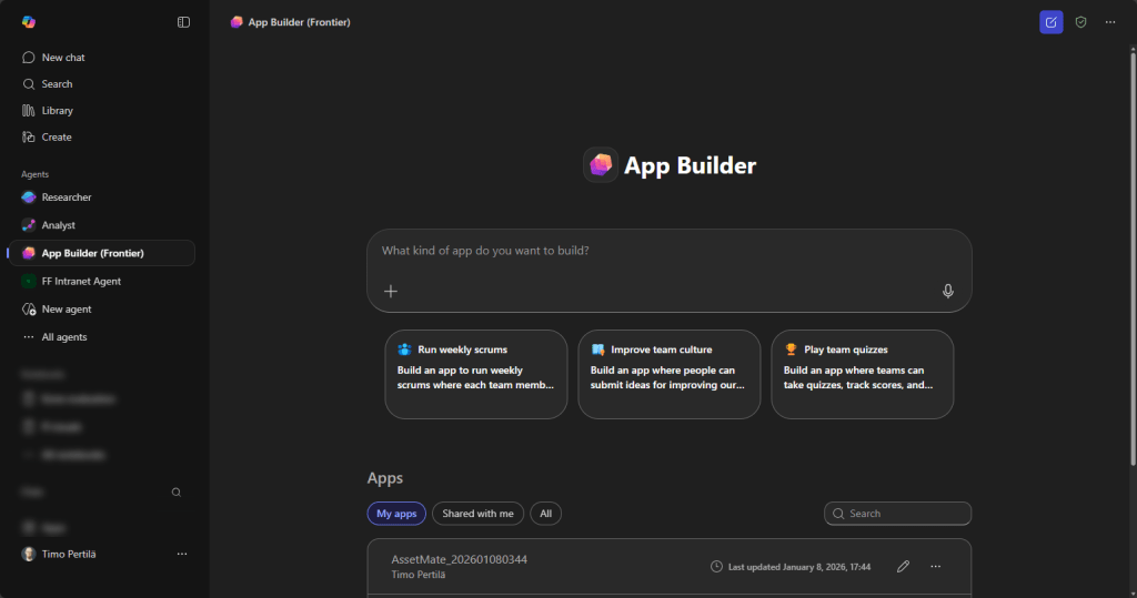 App Builder on käytännössä Microsoft 365 Copilotissa majaileva agentti, jonka käyttäjä ottaa käyttöönsä Agent Storesta. Organisaatio voi määritellä ketkä sen voivat ottaa käyttöönsä. Hienoa!