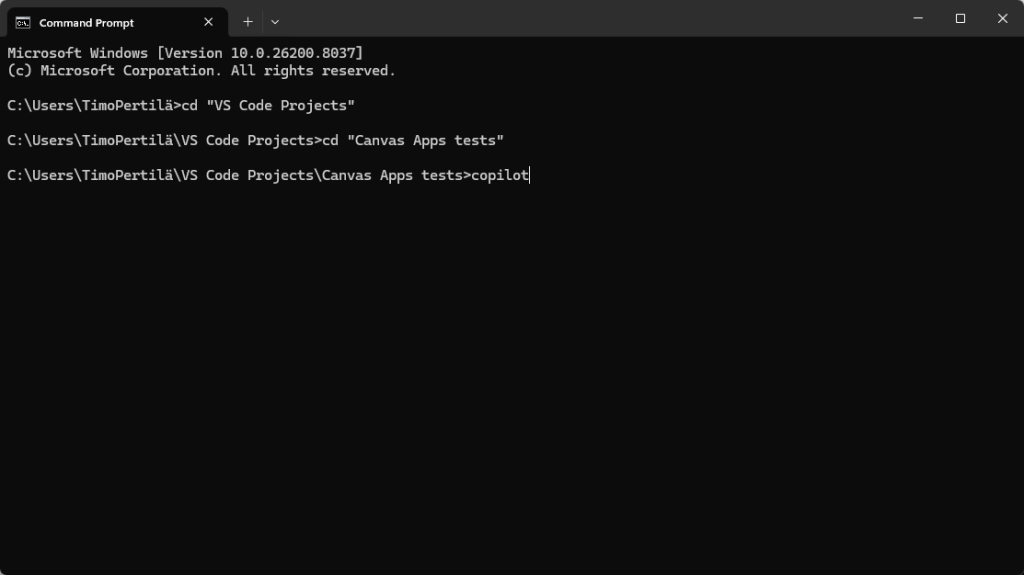 Avataan komentorivi, navigoidaan työkansioon (jonne Copilot esimerkiksi hakee Canvas Appsin koodit) ja käynnistetään copilot.
