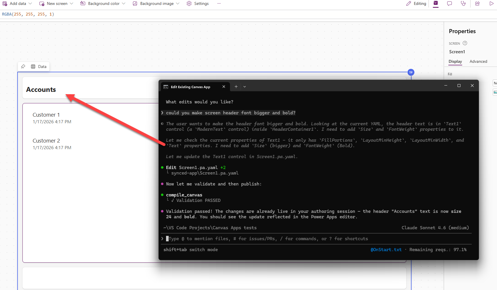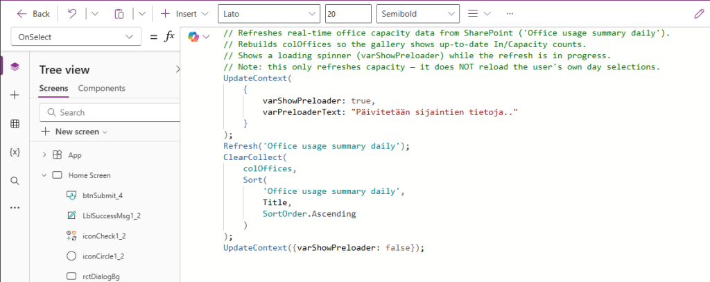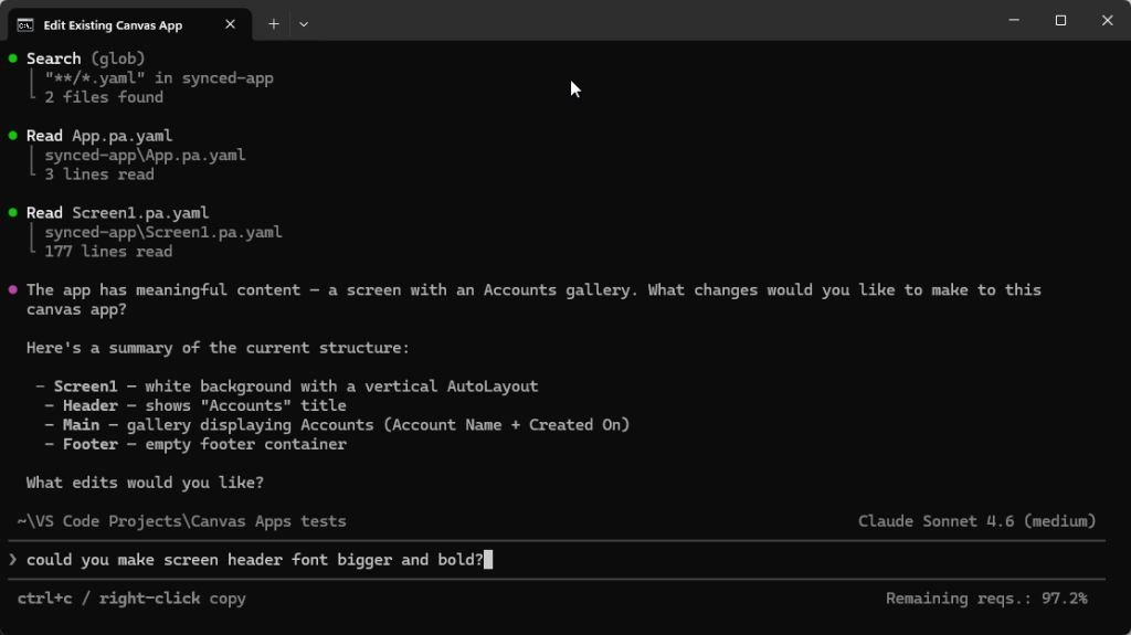 Muutoksia pääsee tekemään kunhan GitHub Copilot pystyy lukemaan Canvas Appsin kooditiedostot (yaml-tiedostot).