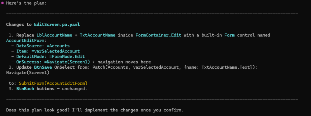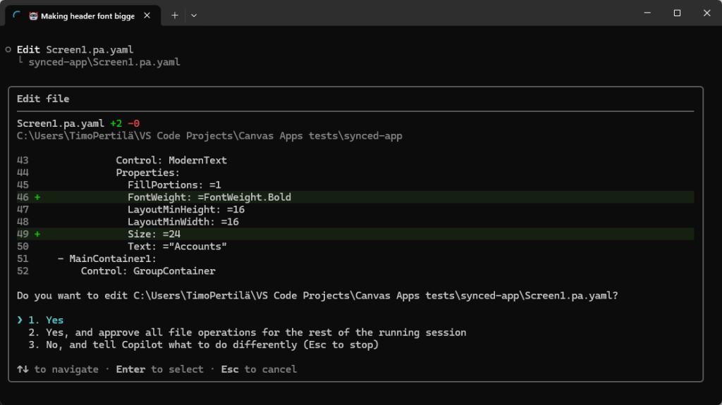 Copilot varmistaa onko paikalliseen yaml-tiedostoon tehty muutos oikein. Mikäli yaml-formaatti ja Canvas Power Appsit eivät ole tuttuja, niin tähän saattaa olla vaikeaa ottaa kantaa.