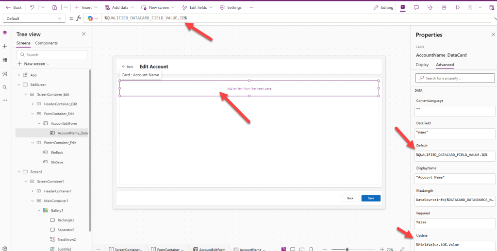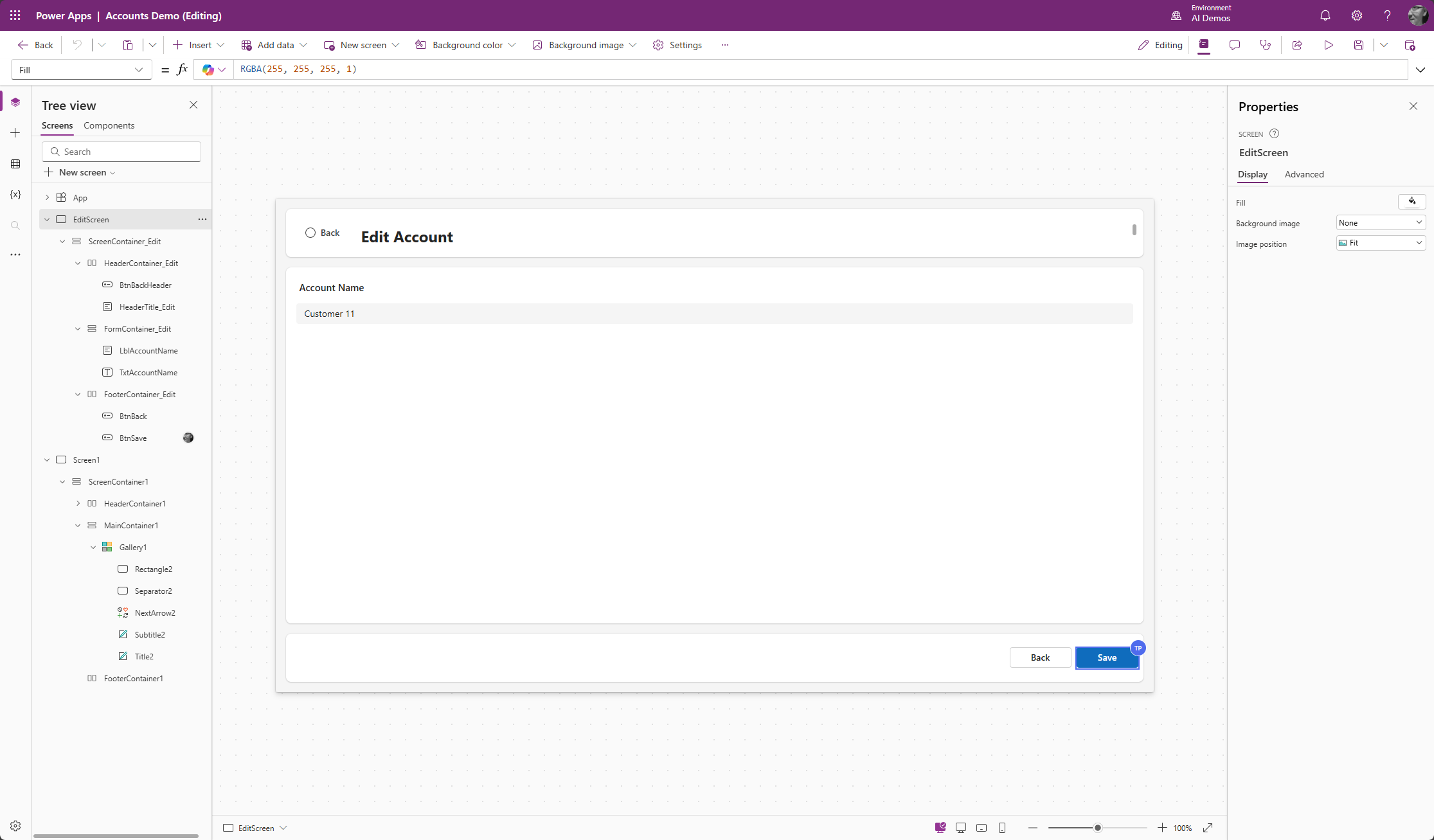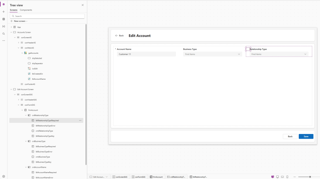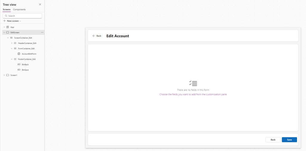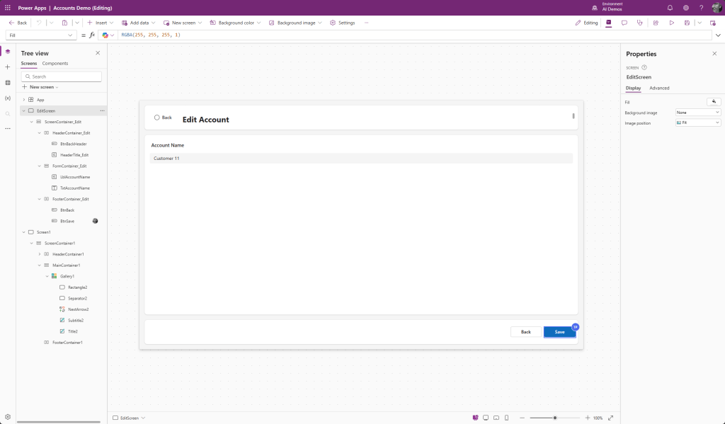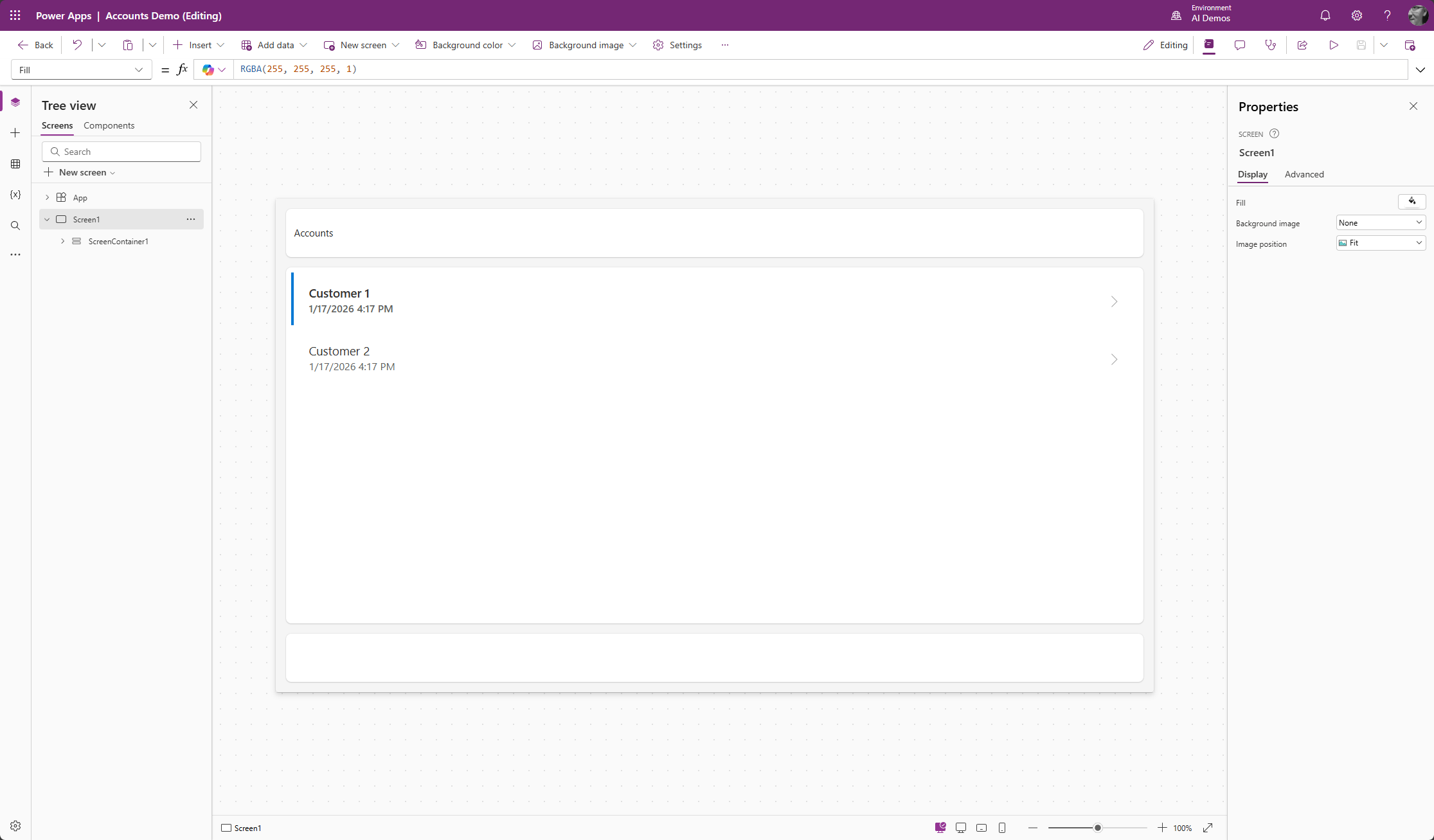 Avataan Canvas App, johon haluamme tehdä muutoksia. Sovelluksessa on yksi näyttö, jossa on listattuna asiakkaat (accounts) Dataversestä.