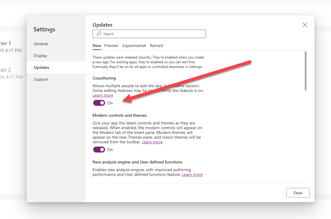 Canvas Power Apps -taito hyödyntää MCP-palvelinta, joka taas käyttää Canvas -sovelluksen coauthoring -ominaisuutta, eli se tulee laittaa päälle.